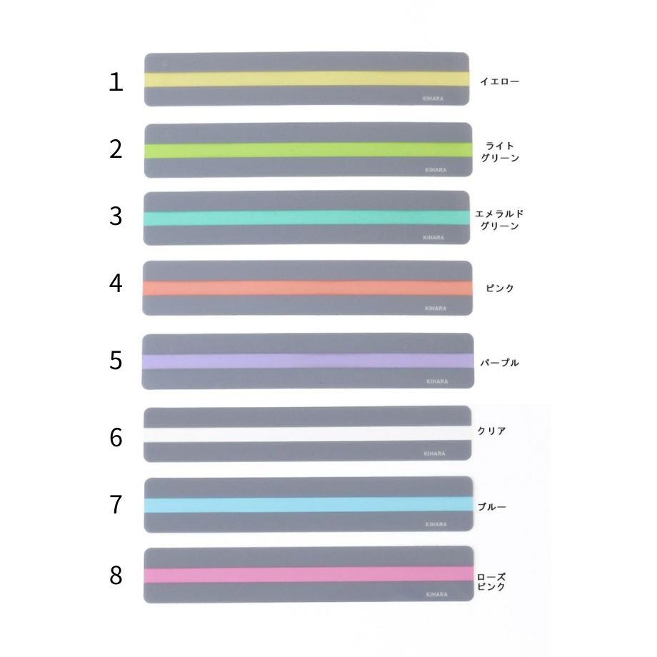 カラー:①イエロー、②ライトグリーン、③エメラルドグリーン、④ピンク、⑤パープル、⑥クリア(透明)、⑦ブルー、⑧ローズピンク