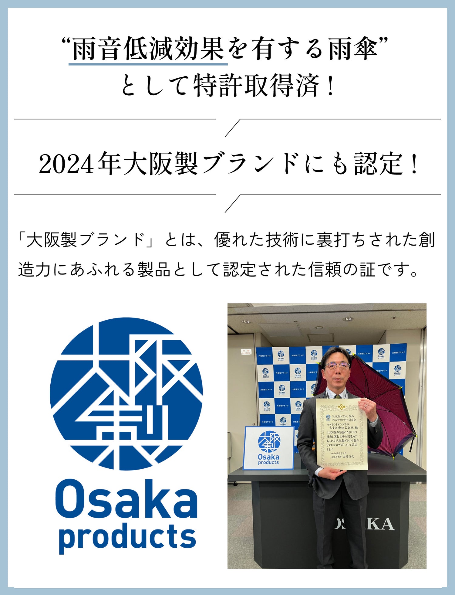 | 商品説明 | 二重構造により雨音の軽減、紫外線・日交の遮断を実現した静かな傘です。 |